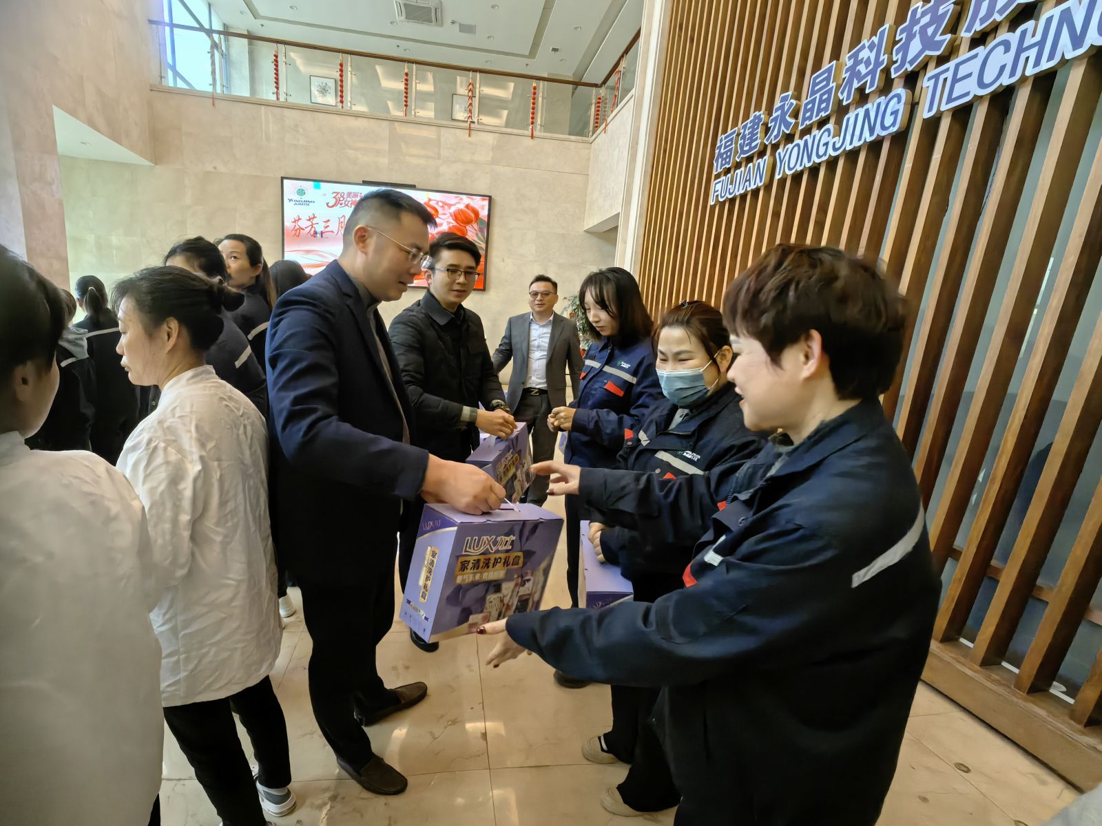 3月6日下午,春意正浓,永晶科技一场温馨而隆重的节日慰问在花香中悄然启幕。总经理王建军、技术总工孙家强、晒口分公司总经理杨涛、总经理助理陈荣、工会主席陈平,手捧带着晨露的芬芳鲜花,携一份份精心挑选的节日礼盒,亲手递到女职工们手中。那一瞬,关怀不再是抽象的词,而是掌心的温度;仪式不再是形式,而是心底的回响。